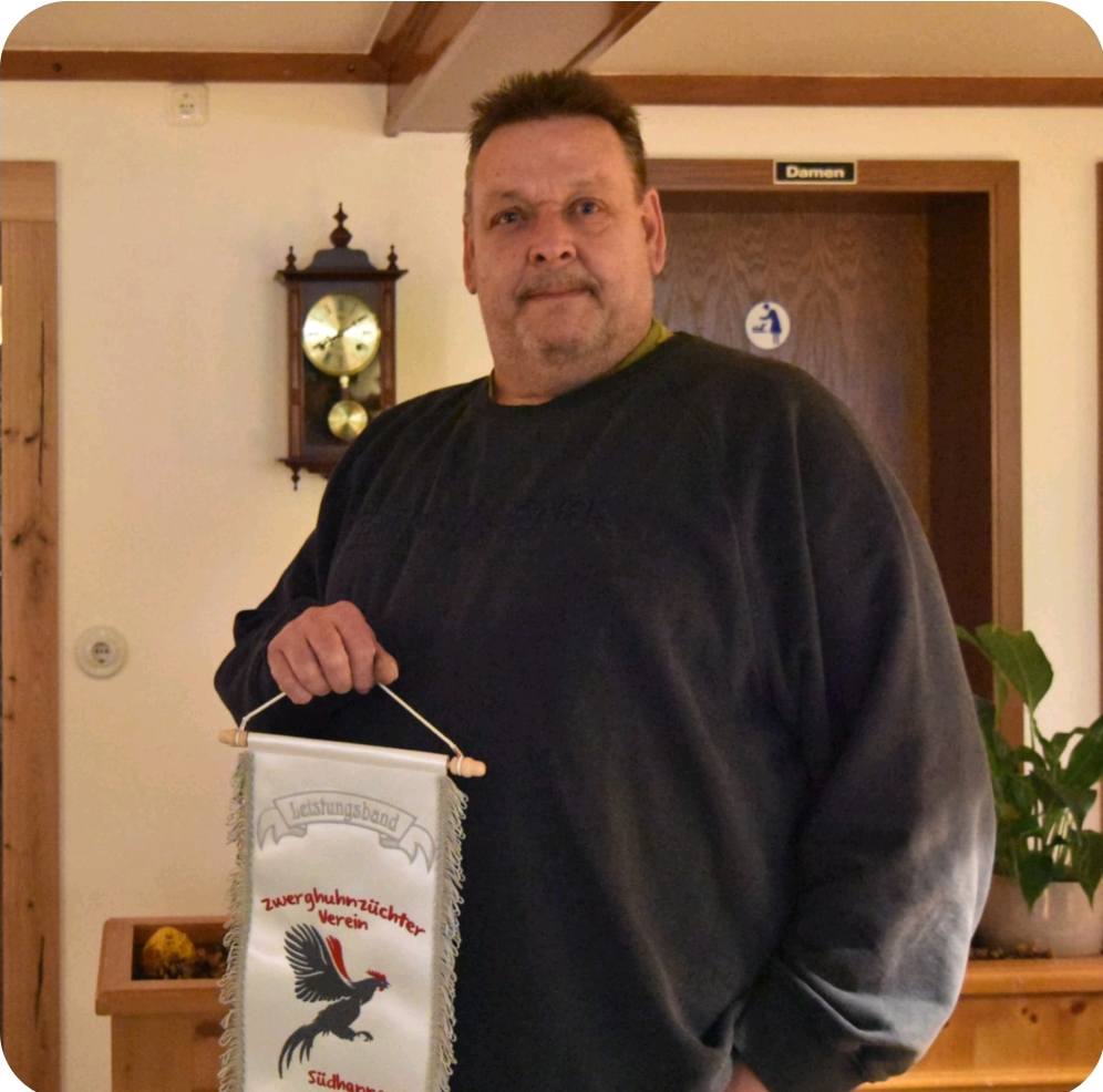 David Fuchs mit Zwerg Seidenhühner mit bart schwarz Europameister